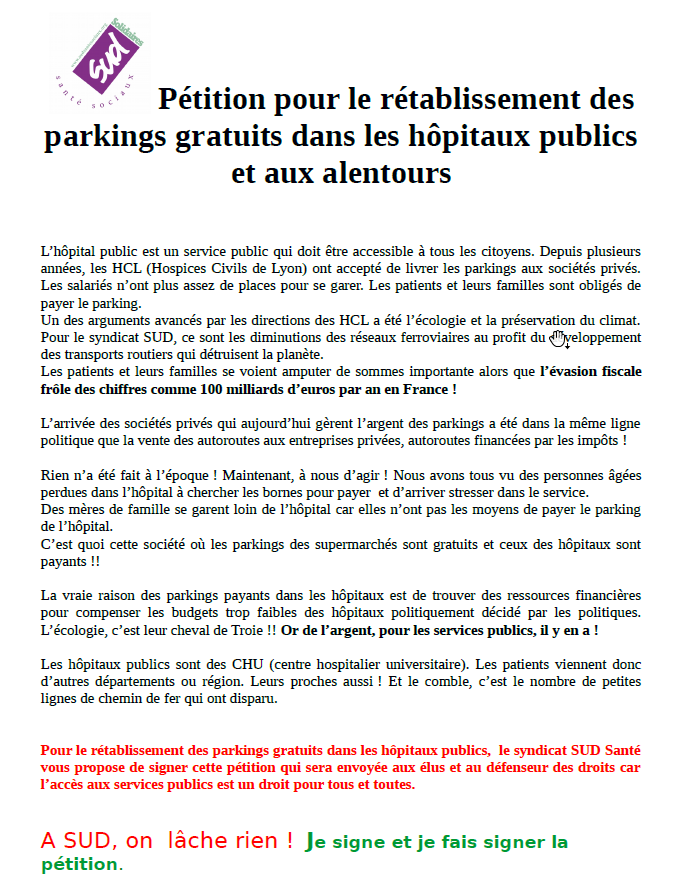 Pour le rétablissement des parkings gratuits dans les hôpitaux publics, le syndicat SUD Santé vous propose de signer cette pétition qui sera envoyée aux élus et au défenseur des droits car l’accès aux services publics est un droit pour tous et toutes.