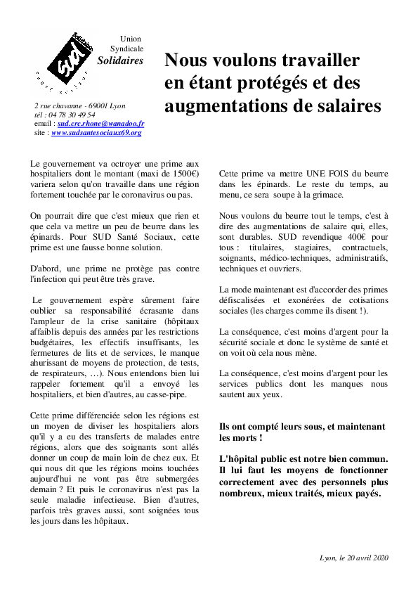 Nous voulons travailler en étant protégés et des augmentations de salaires Article mis en ligne le 21 avril 2020 par F.D. Le gouvernement va octroyer une prime aux hospitaliers dont le montant (maxi de 1500€) variera selon qu’on travaille dans une région fortement touchée par le coronavirus ou pas.