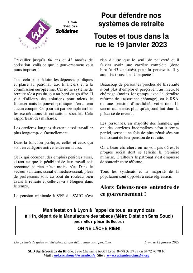 Pour défendre nos systèmes de retraite Toutes et tous dans la rue le 19 janvier 2023 Manifestation à Lyon à l’appel de tous les syndicats Article mis en ligne le 12 janvier 2023 par F.D. Manifestation à Lyon à l’appel de tous les syndicats à 11h, départ de la Manufacture des tabacs (Métro D station Sans Souci) pour aller place Bellecour ON NE LÂCHE RIEN !