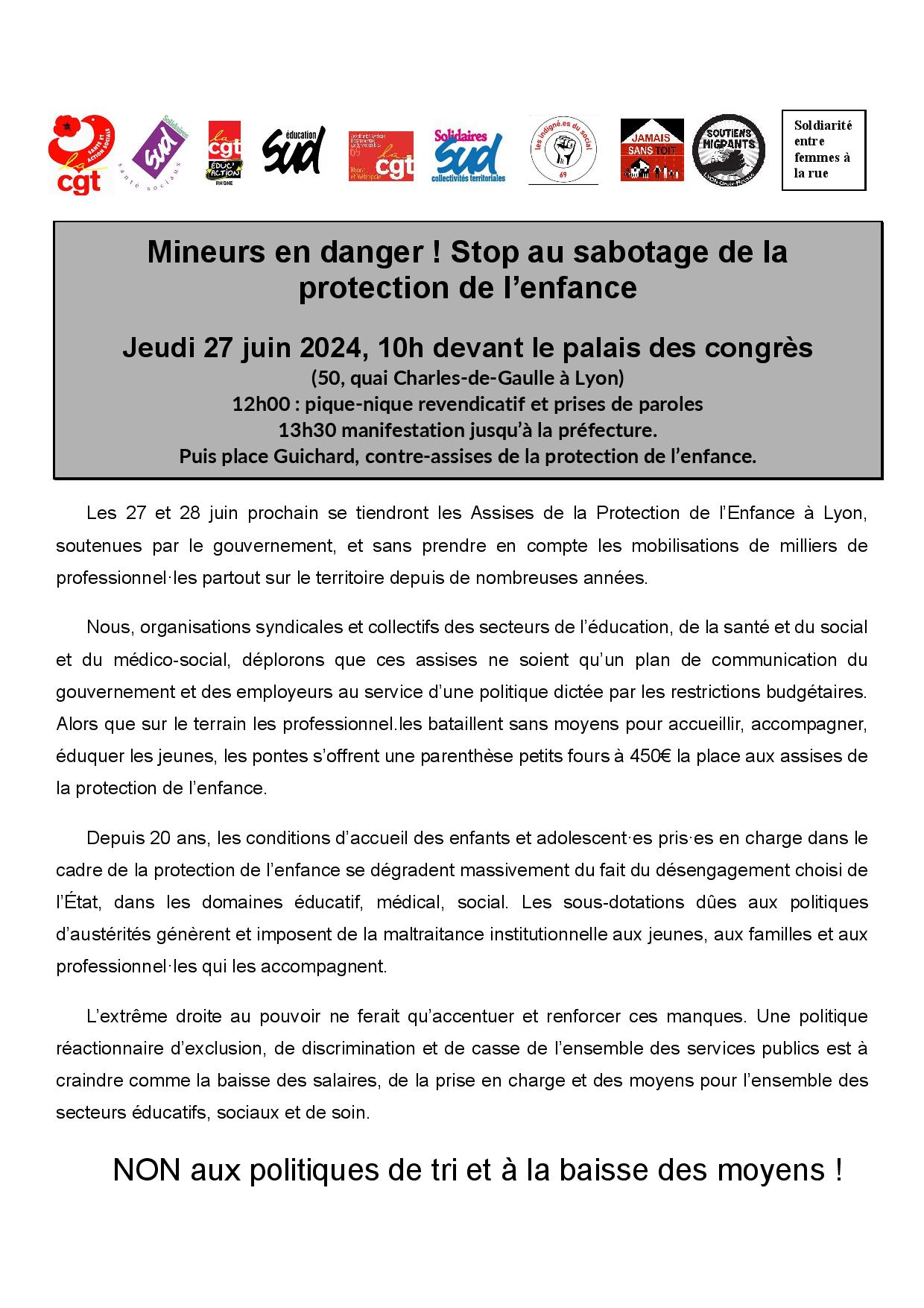 Mineurs en danger ! Stop au sabotage de la protection de l’enfance Jeudi 27 juin 2024, 10h devant le palais des congrès (50, quai Charles-de-Gaulle à Lyon)
